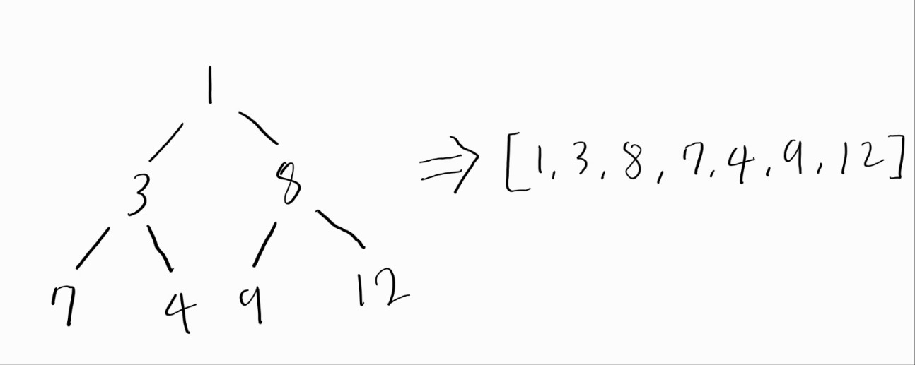 트리의 노드를 위에서 아래로, 그리고 각 레벨에서 왼쪽에서 오른쪽으로 배열에 저장한다. 예를들어 다음과 같은 최소힙이 있다고 가정했을때 배열에 저장된모습은 다음과 같다