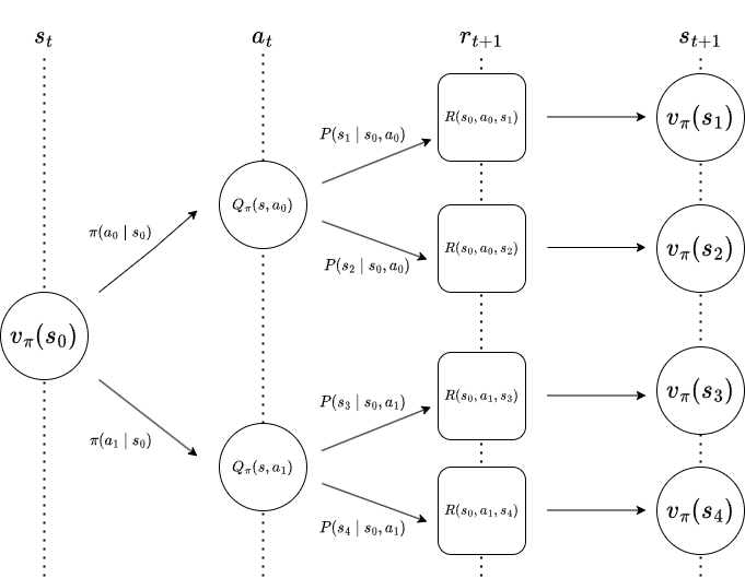 $$q_\pi(s, a) = R(s, a) + \gamma \sum_{s'} P(s' \mid a, s) v_\pi(s')$$