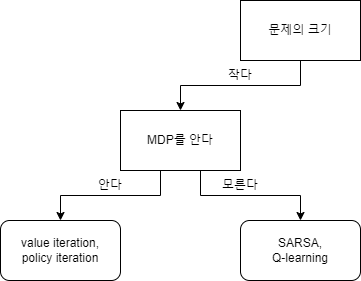 지금까지 배운 강화학습 지식을 이용해 어떤 문제에 대해 강화학습 알고리즘을 적용하고 싶다면 다음과 같은 결정트리(Decision Tree)를 이용할 수 있다.