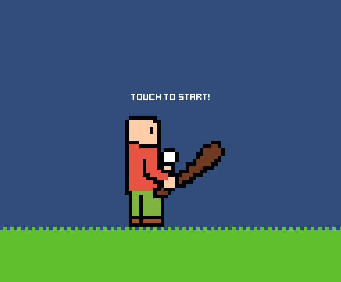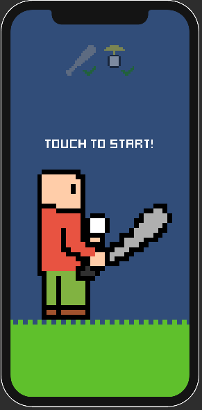 결과화면2는 공을 치지못해 공이 바닥에 떨어져있는 모습입니다. 그리고 메인화면은 다시 공을 들고 서있는 모습입니다. 터치할경우 결과화면2에서 메인화면으로 전환되는데 아무래도 캐릭터의 자세가 바로 바뀌다보니 어색한 느낌이 들었습니다. => 이후 touch to restart를 누를필요없이 자동으로 떨어진 공을 줍도록 수정되었습니다.