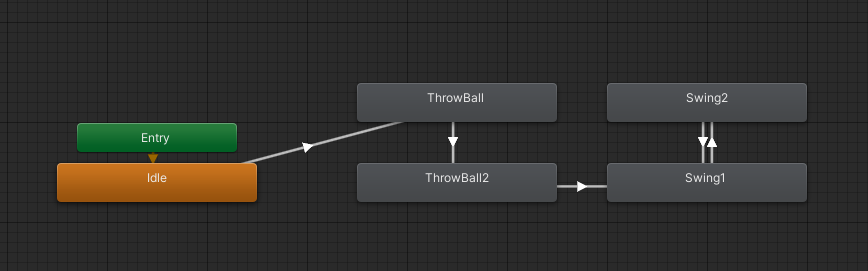 - 애니메이션은 트리거에 의해 실행됩니다. ⇒ 어떠한 스윙도 하지않았을때는 ThrowBall2 상태이고 스윙을 한번 이상한 상태에서는 Swing1 상태이기때문에 두 상태에서 모두 공줍는 애니메이션으로 전이되기 위해서는 anystate의 활용이 필요했습니다.